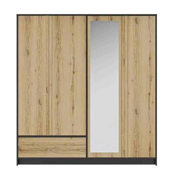 4 doors and 1 drawer 1/2 shelving (3 shelves, 1 drawer) 1/2 hanging space, 1 mirror